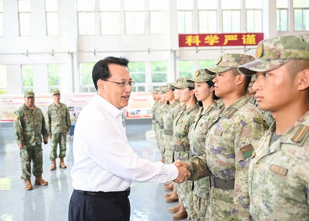 7月31日上午,在联勤保障部队工程大学,市委书记袁家军同学员代表握手交谈。记者 苏思 摄/视觉重庆