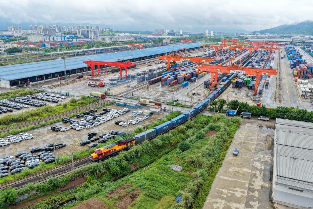9月13日,满载汽车零配件、笔记本电脑等货物的中亚班列在重庆团结村中心站发车(无人机照片)。