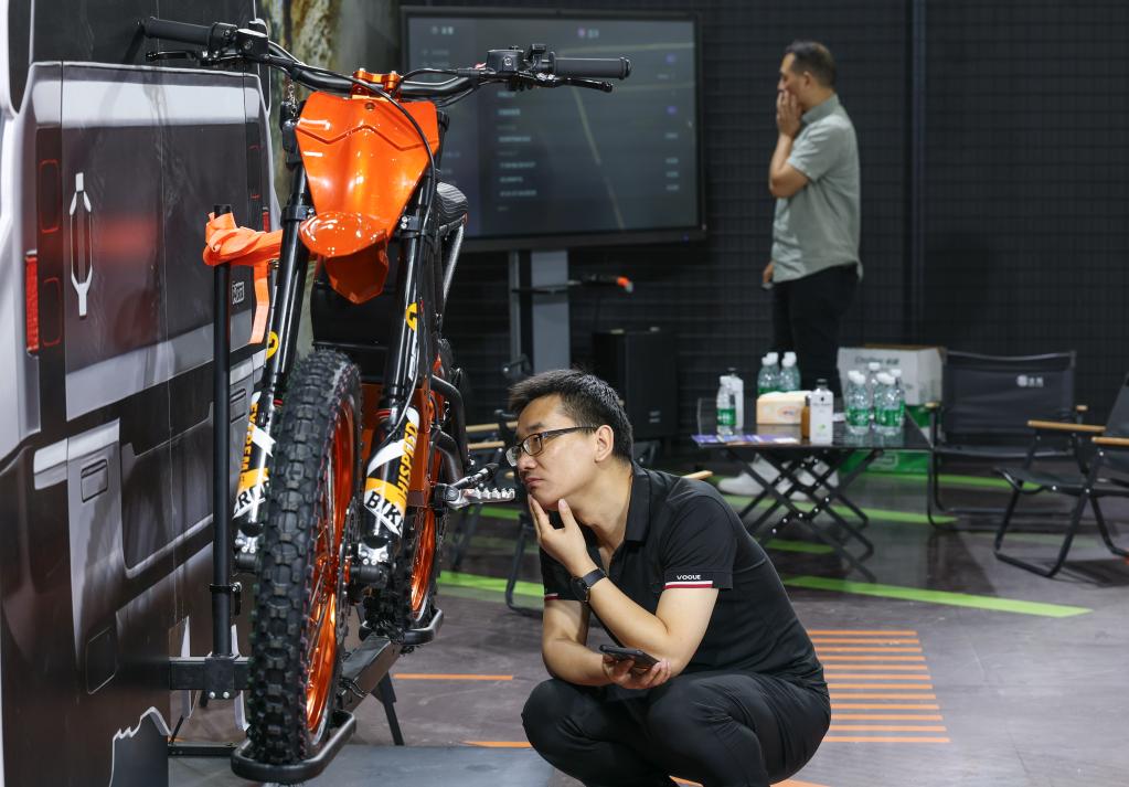 9月19日,观众在摩博会现场了解国产新能源摩托车性能。