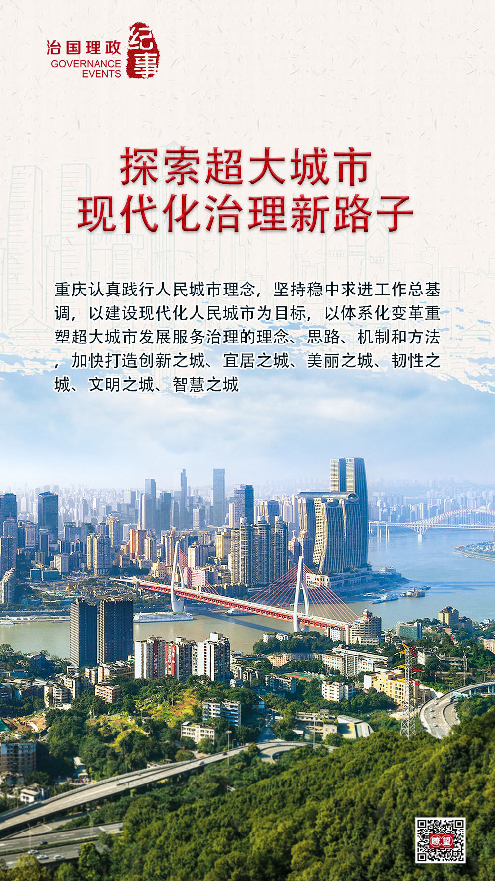 山与江交汇、城与乡融合、智与治协同,重庆超大城市现代化治理的新路子日益清晰。面向未来,重庆将加快推进创新、开放、便捷、宜居、生态、智慧、人文之城建设,不断挖掘超大城市现代化治理丰富内涵,让高质量发展、高品质生活、高效能治理相向而行、协同推进。