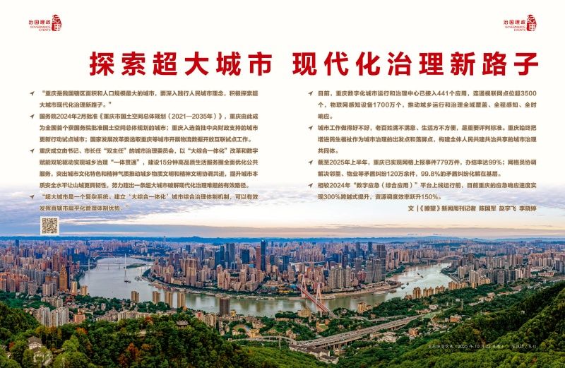 重庆出台《重庆市建设超大城市现代化治理示范区实施意见》《重庆中心城区“大综合一体化”治理实施方案》《重庆超大城市现代化治理示范区2025年行动方案》等一系列政策举措,成立由书记、市长任“双主任”的城市治理委员会,以“大综合一体化”改革和数字赋能双轮驱动实现城乡治理“一体贯通”,建设15分钟高品质生活服务圈全面优化公共服务,突出城市文化特色和精神气质推动城乡物质文明和精神文明协调共进,提升城市本质安全水平让山城更具韧性,努力蹚出一条超大城市破解现代化治理难题的有效路径。